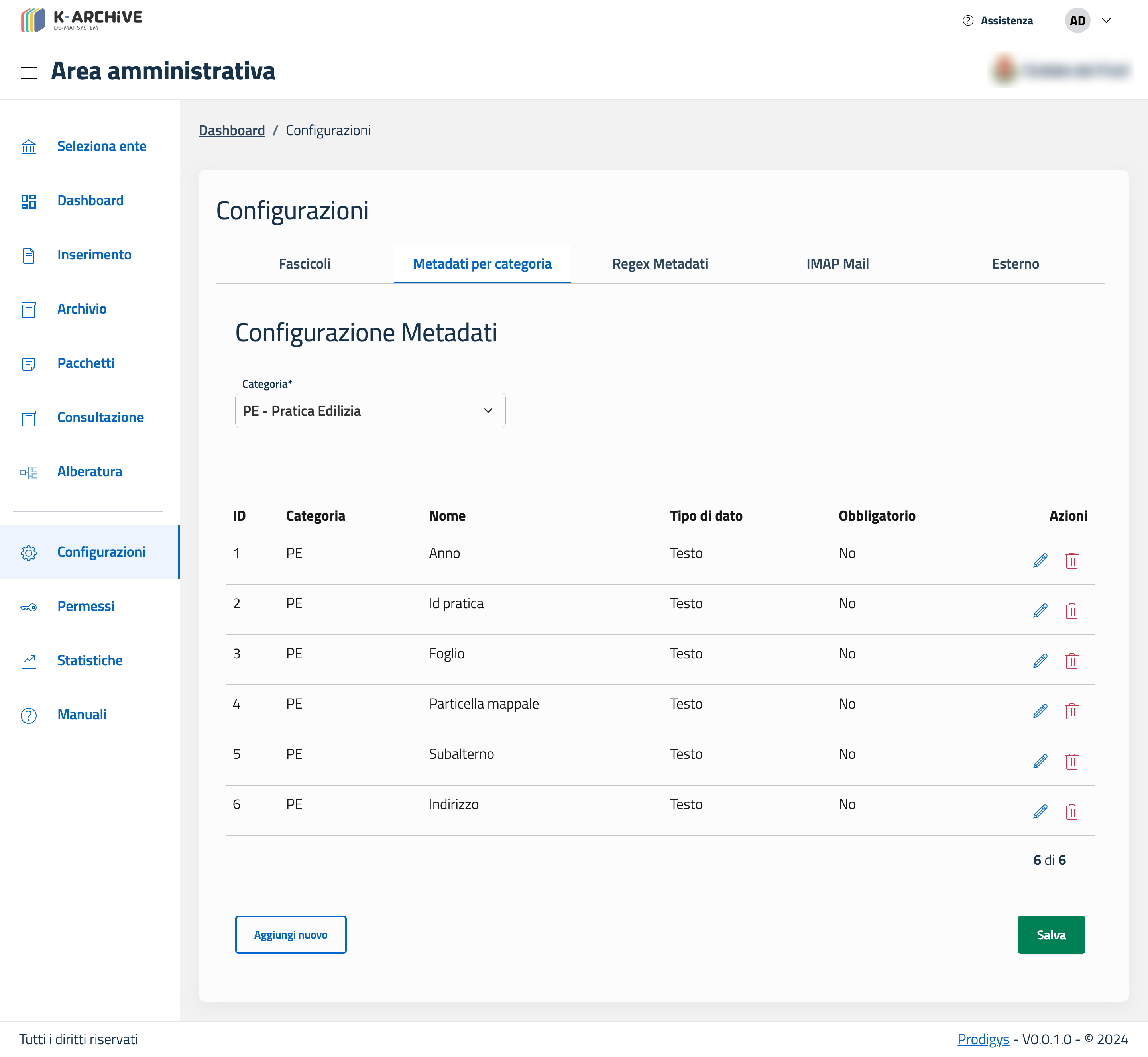 La sezione Configurazioni è accessibile dal menu laterale e permette di definire dinamicamente dei parametri di archiviazione che rispondono alle precise esigenze dell’ente. In particolare, è possibile definire tutti i metadati possibili da compilare per l’archiviazione di documenti appartenenti ad una specifica categoria da selezionare tra quelle disponibili.