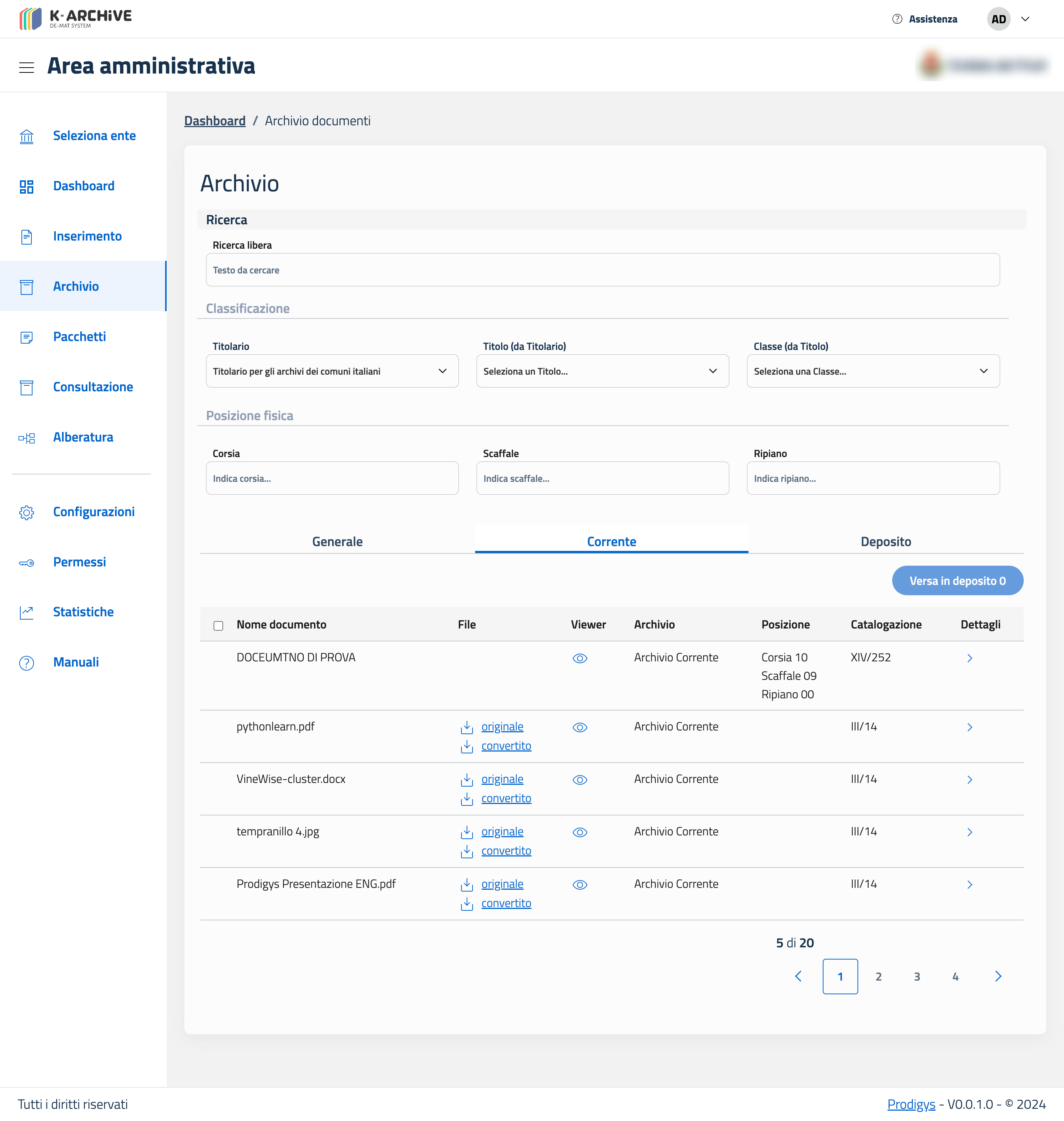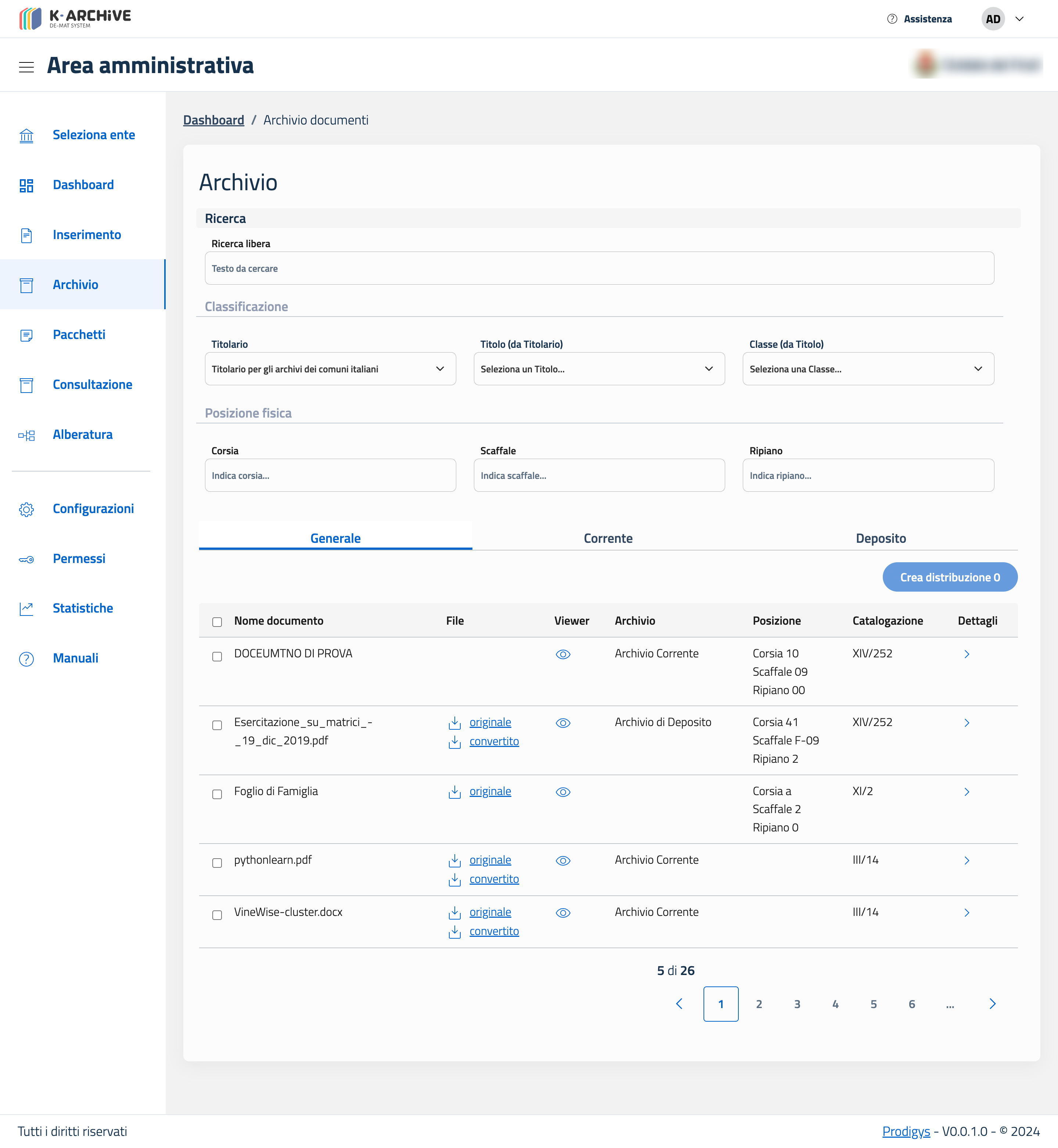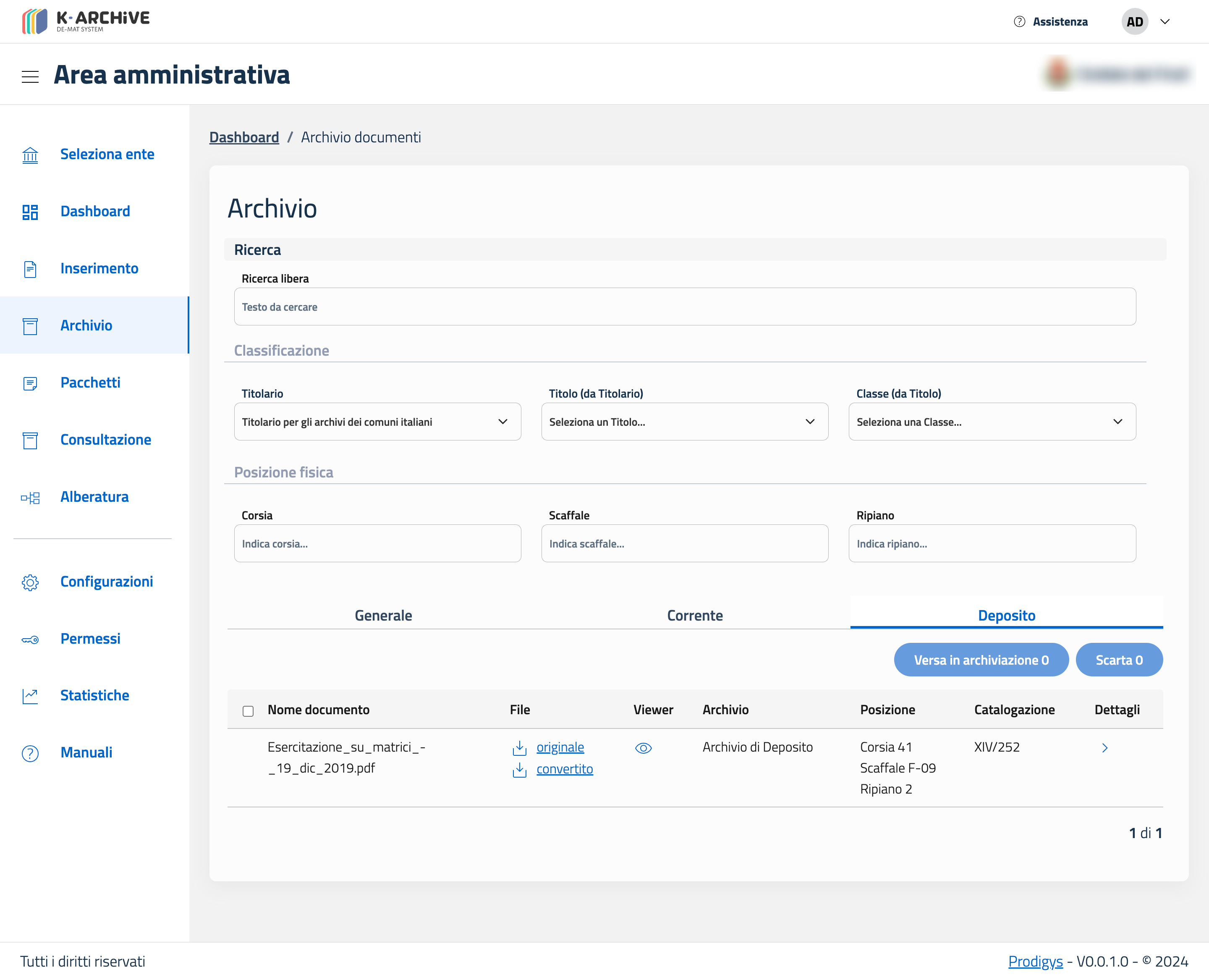 Generale: comprende tutti i documenti caricati a sistema che sono ancora conservati in archivio;