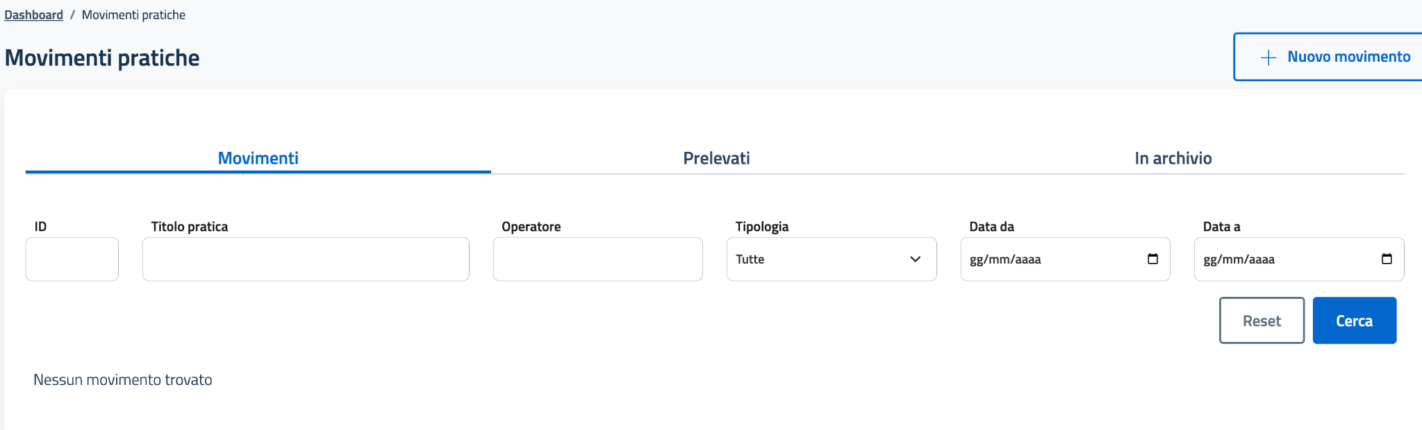 La sezione Movimenti pratiche consente di gestire il ciclo di vita dei documenti all’interno del sistema, tracciando tutte le operazioni di prelievo, consultazione e archiviazione.