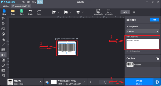 Nella parte destra della finestra nel campo “BarCode data” inserire il codice che si desidera stampare e premere Print